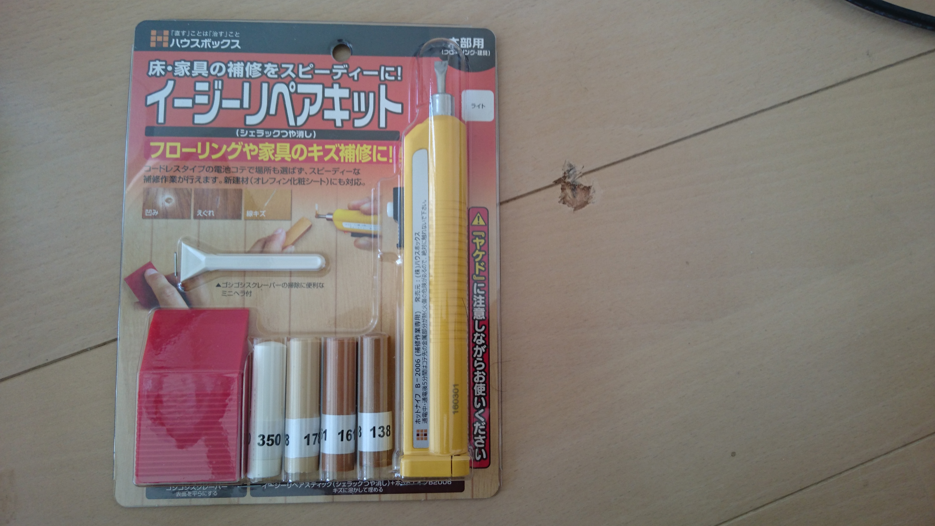 とまあ悩んでもしょうがない!切り替えの早さが取り柄の管理人です(笑。まだこの家に住み続けるつもりなので、目立つ傷はそのたび思い出してしまうし、気持ちのいいものではないので、とりあえず自分で応急処置をしてみることにしました!直れば儲けものくらいの考えで、やってみたのですが最近は結構すごい製品が出ていて、結構簡単に補修することができます。